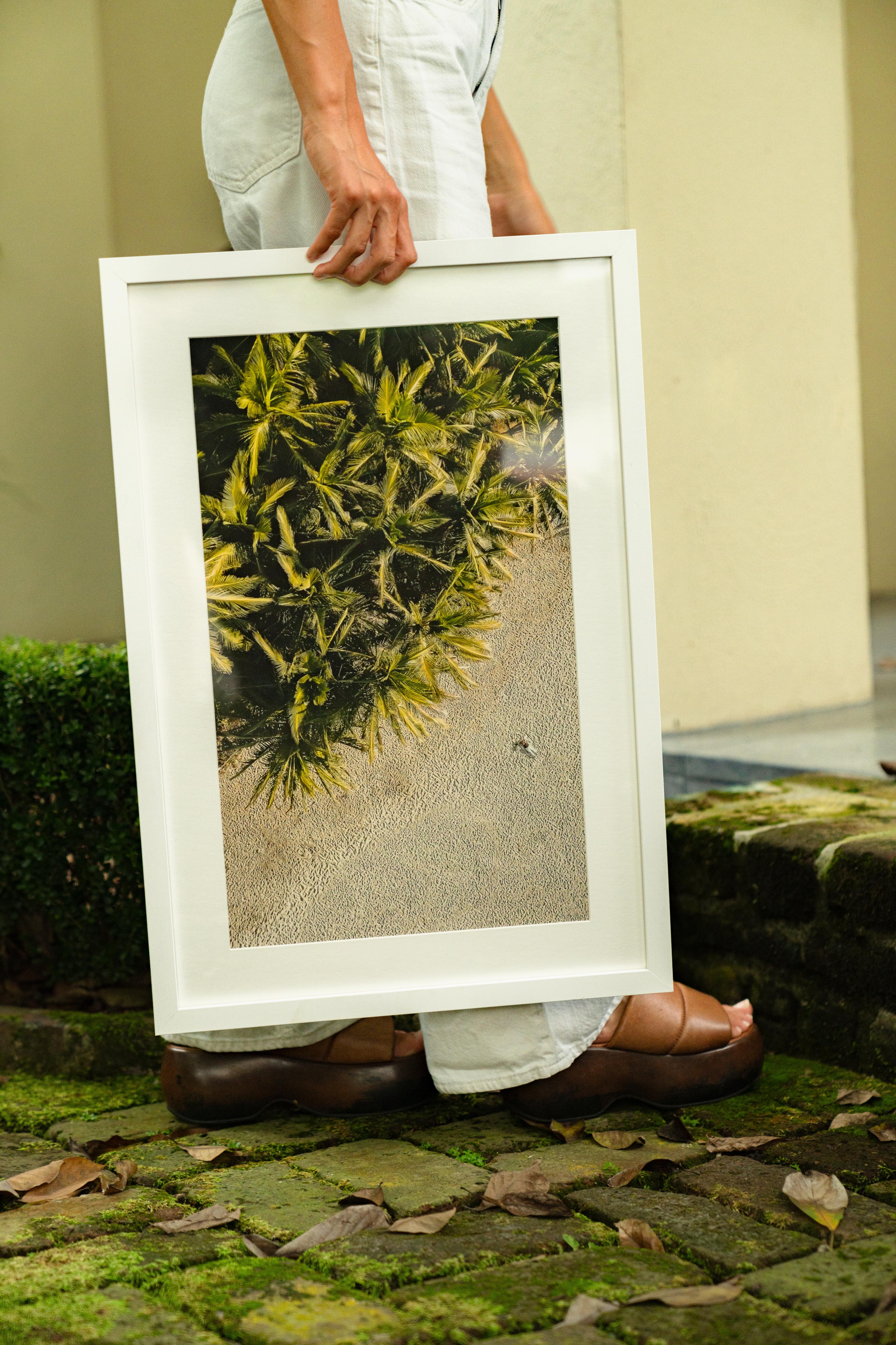 A quiet beach in Mexico, tucked beside dense palms. One person, alone in the sand, captured in a moment of stillness and escape.